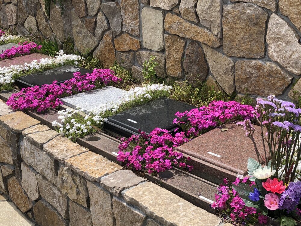 霊園には鮮やかなピンク色や白色、薄紫色の芝桜が咲いています。
